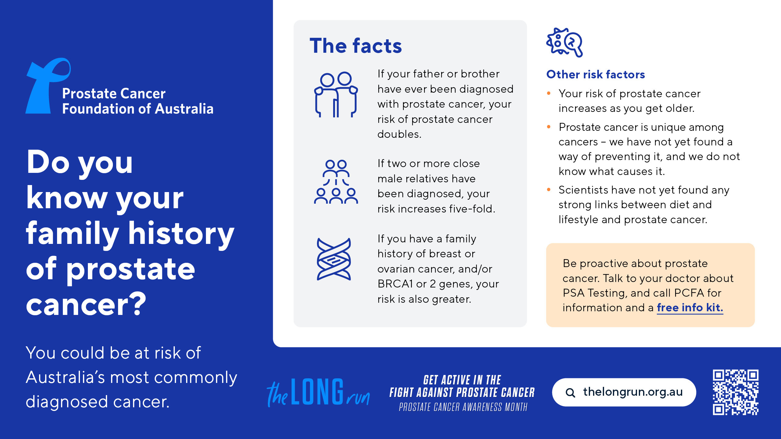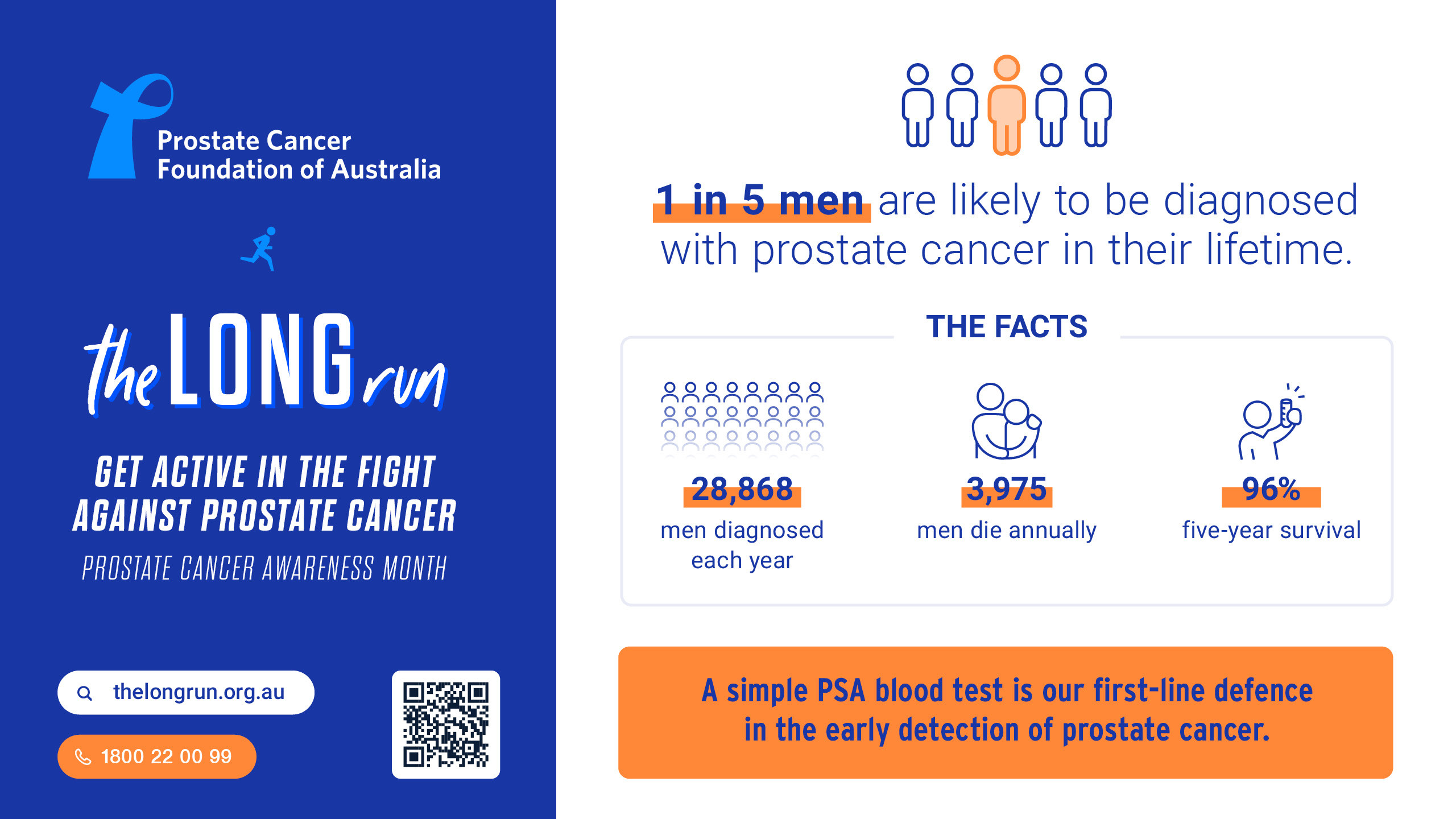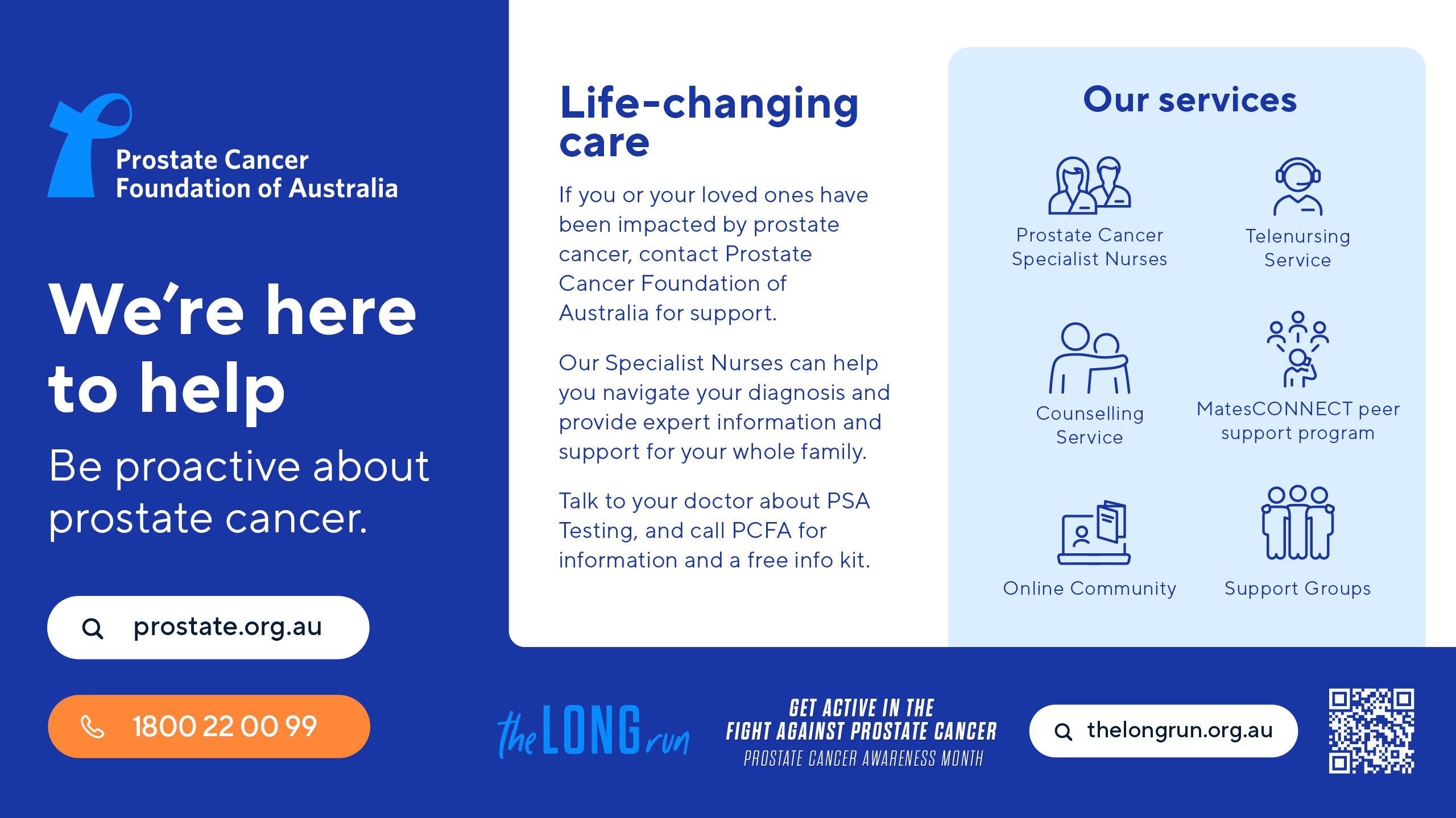 Download and share our awareness posters and join the PCFA-Team. You'll be making a measurable difference for the 1 in 5 men in your life, diagnosed with prostate cancer in their lifetime.